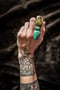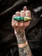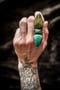 Three earth-hued turquoise stones set in sterling & fine silver. Sterling torch-fused accents. Can be mounted upon band vertically or horizontally (see photos for examples).